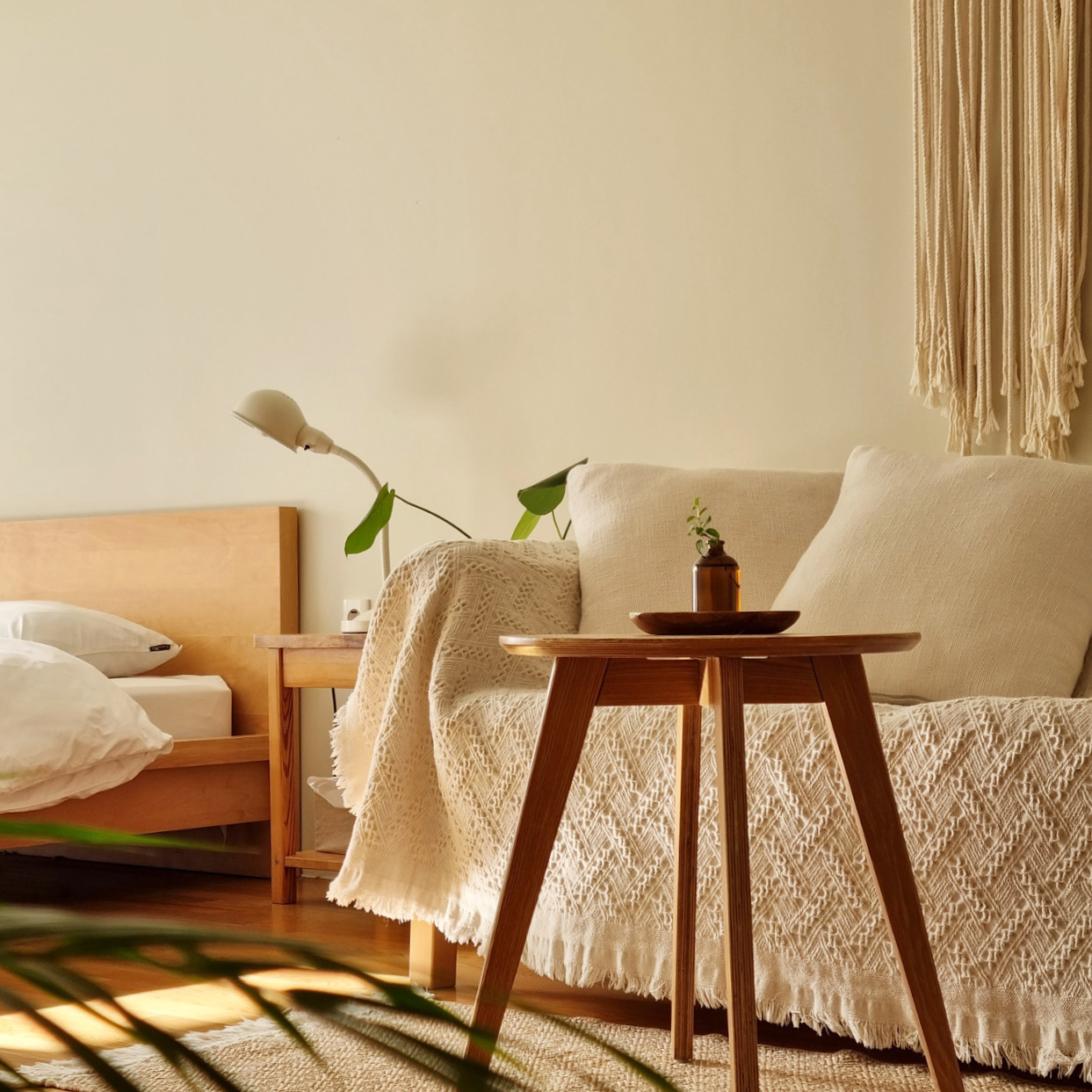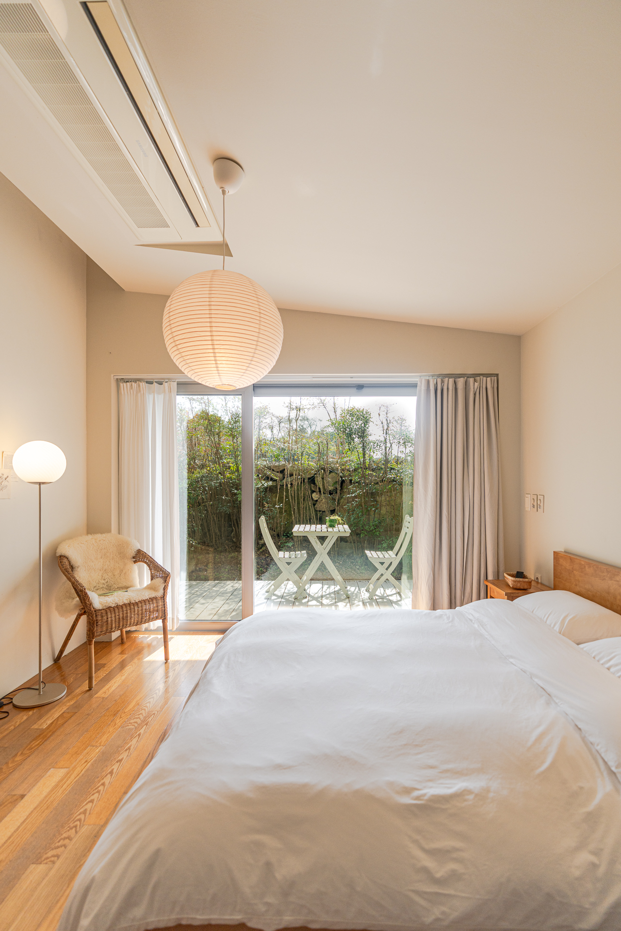 창밖 푸른 숲이 드리운 고요한 아침, 햇살이 침대 위를 포근히 감쌉니다.