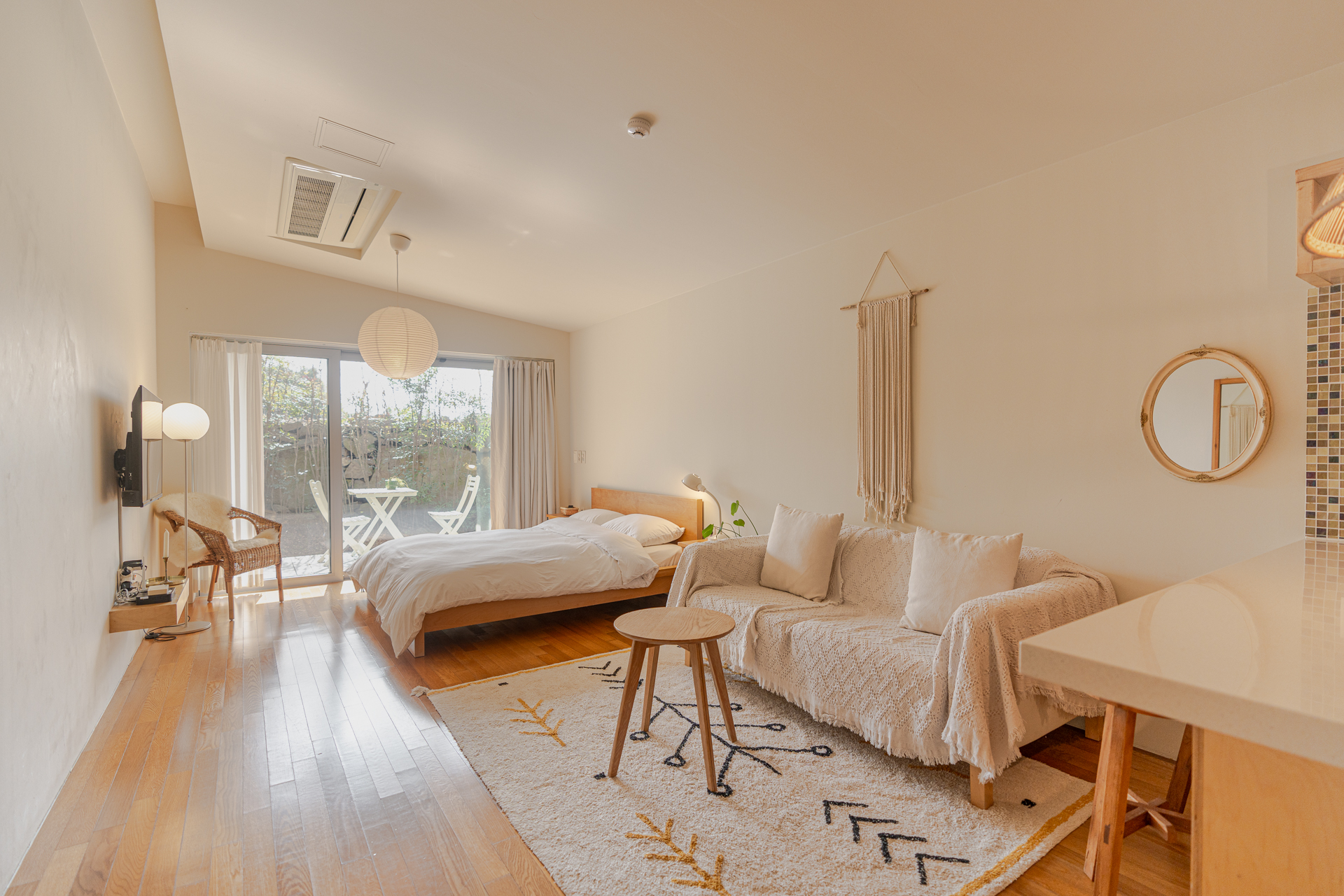 안녕하세요 :) 바람 객실은 모던 하고 깔끔한 분위기로 넓은 욕실과 욕조를 갖추고 있는 2인 커플 독채 입니다. 바람 객실은 1박 부터 예약 가능 하세요. 1. 기본 시설 : 침대, 시스템 에어컨, 냉장고, 인덕션, TV, 생수 2병. 2. 욕실 용품 : 욕조, 페이스 타올, 손 세정제, 린스, 샴푸, 바디클렌져, 드라이기 3. 취사도구 : 전자레인지, 전기 포트, 냄비, 후라이팬, 그릇, 수저, 가위, 와인잔, 컵, 기타. [숙소 20분 내 관광지] - 한담 카페거리 - 곽지 해변. - 애월 해안도로. - 금오름. - 아르떼 뮤지엄. - 918 파크. * 예약 인원 외 외부인 초청 절대 금지합니다. 펜션은 거주 공간이 아닌 숙박 시설임을 양해 부탁 드립니다. * 운영 상황에 따라 최소 숙박 일을 2일 이상으로 판매될 수 있습니다. [기타 안내 사항] 숙소 내에 전체 금연 구역이므로 흡연으로 인한 비용이 발생할 수 있습니다. 숙소 운영 및 편안한 숙소 사용을 위해, 예약 확정 시 약관과 조건에 대한 사항을 숙지하시기를 권장 드립니다. 방역 업체를 통해 전문적, 주기적으로 방역을 진행 중이고 저희쪽 에서도 추가로 방역을 실시하고 있습니다만, 지역 특성상 곤충 및 해충이 유입될 수 있다는 점 양해 부탁드립니다. (이로 인한 환불은 불가 합니다.) 손님의 안전과 도난 방지를 위해 주차장 방향으로 cctv가 설치되어 있습니다. 시설물과 비품을 훼손 하였을 시 퇴실 전 미리 말씀 부탁 드립니다. 반려 동물 입실은 불가 합니다. 부가 서비스나 시설 이용은 숙소나 날씨 상황에 따라 제한될 수 있습니다. 이로 인한 숙박 비용 환불(일부 보상)은 불가 합니다. 연박 시 중간 청소는 진행되지 않는 점 양해 부탁 드립니다. 객실 최대 인원 초과 시 추가 요금이 발생하거나 입실이 거부될 수 있습니다. * 환불 규정 안내 * (체크인 날짜 기준.) - 30일 이전 100% - 14일 이전 50% - 7일 이전 30% - 그 외 환불 금액 없습니다.