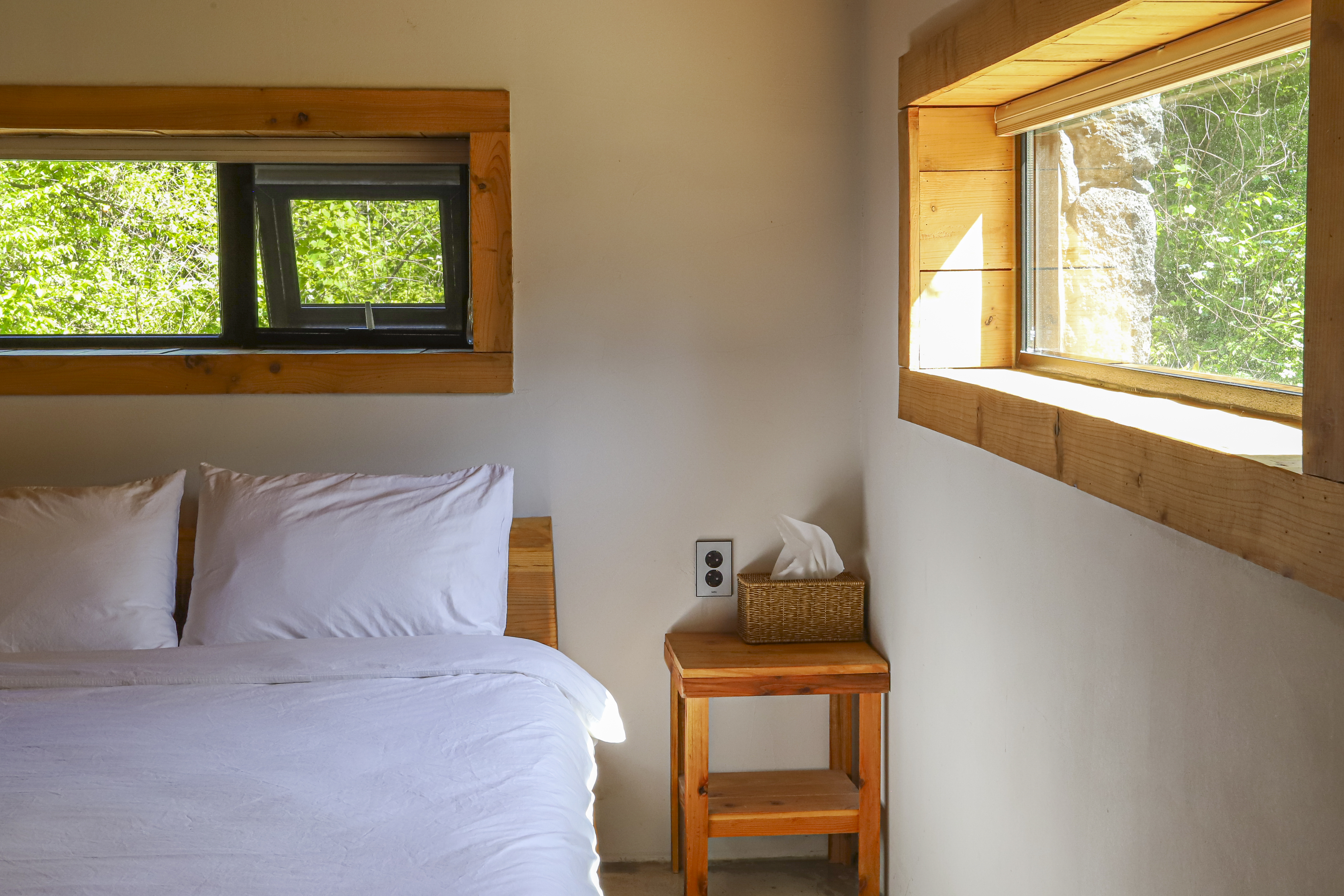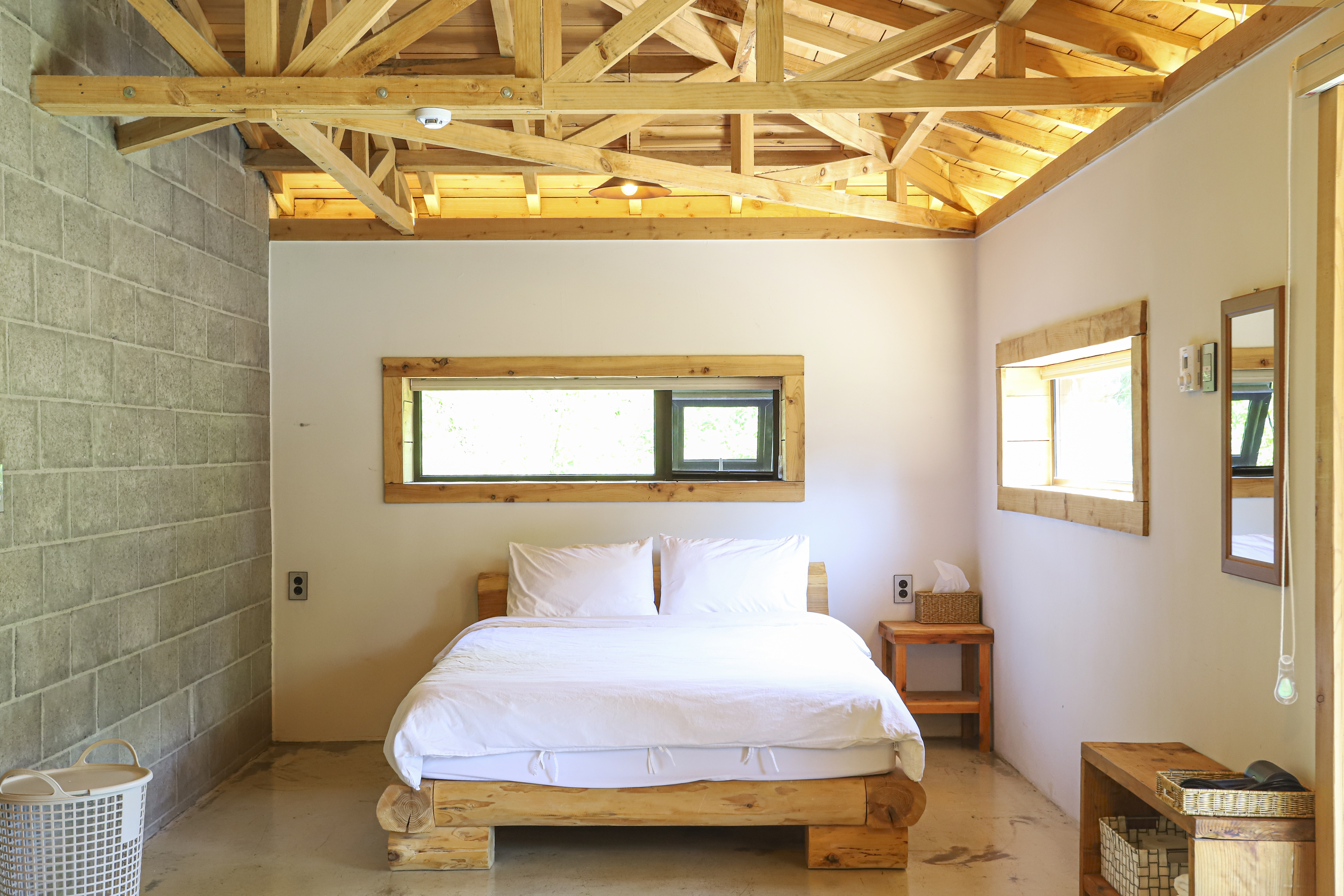 객실 형태: 15평 독채_원룸형(킹), 주방 겸 거실, 좌식 테이블, 넓은 정원