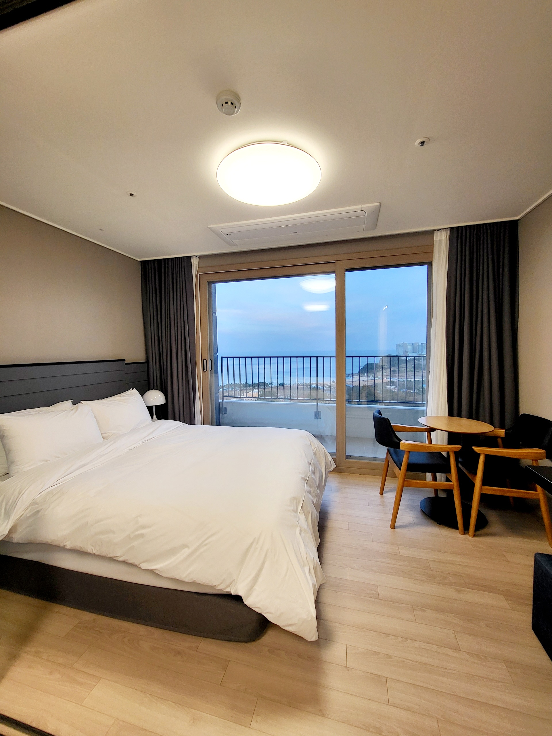 1.5룸 부분 오션뷰 타입별 랜덤배정으로 인테리어는 사진과는 다를 수 있습니다. 프라이빗한 침실에서 일출을 감상하세요 ※ 매회 철저 소독,완벽 침구 교체! ※ 조리도구, 전자렌지, 냉장고, 세탁기, 건조대, 테라스테이블 구비완료! 속초 해수욕장과 터미널에 아주 가까운 접근성 뛰어난 시내면서도 조용하고 한적한 호텔형 개인별장입니다. 속초 최고분양가를 자랑했던만큼 내부자제와 인테리어가 고급스럽고 매우 깔끔합니다. 차량 여러대 넉넉한 주차 가능합니다. 탁트인 동해바다 전망의 파노라마 오션뷰 객실에서 최고의 힐링과 여행을 만드실수 있습니다 넓은 1.5룸 스위트룸 구조이며 테라스를 별도로 보유하고 있습니다. 건물에서도 최고좋은 RR으로 탁트인 오션뷰, 마운틴뷰 입니다. 버스터미널, 해수욕장, 시내, 시장, 항구 모두 인근에 위치해있습니다. 내집같은 편안한 잠자리를 위하여 특급호텔수준 최고급 침구류를 준비하였으며, 호텔식 청소와 린넨서비스로 항상 쾌적과 청결을 유지합니다.