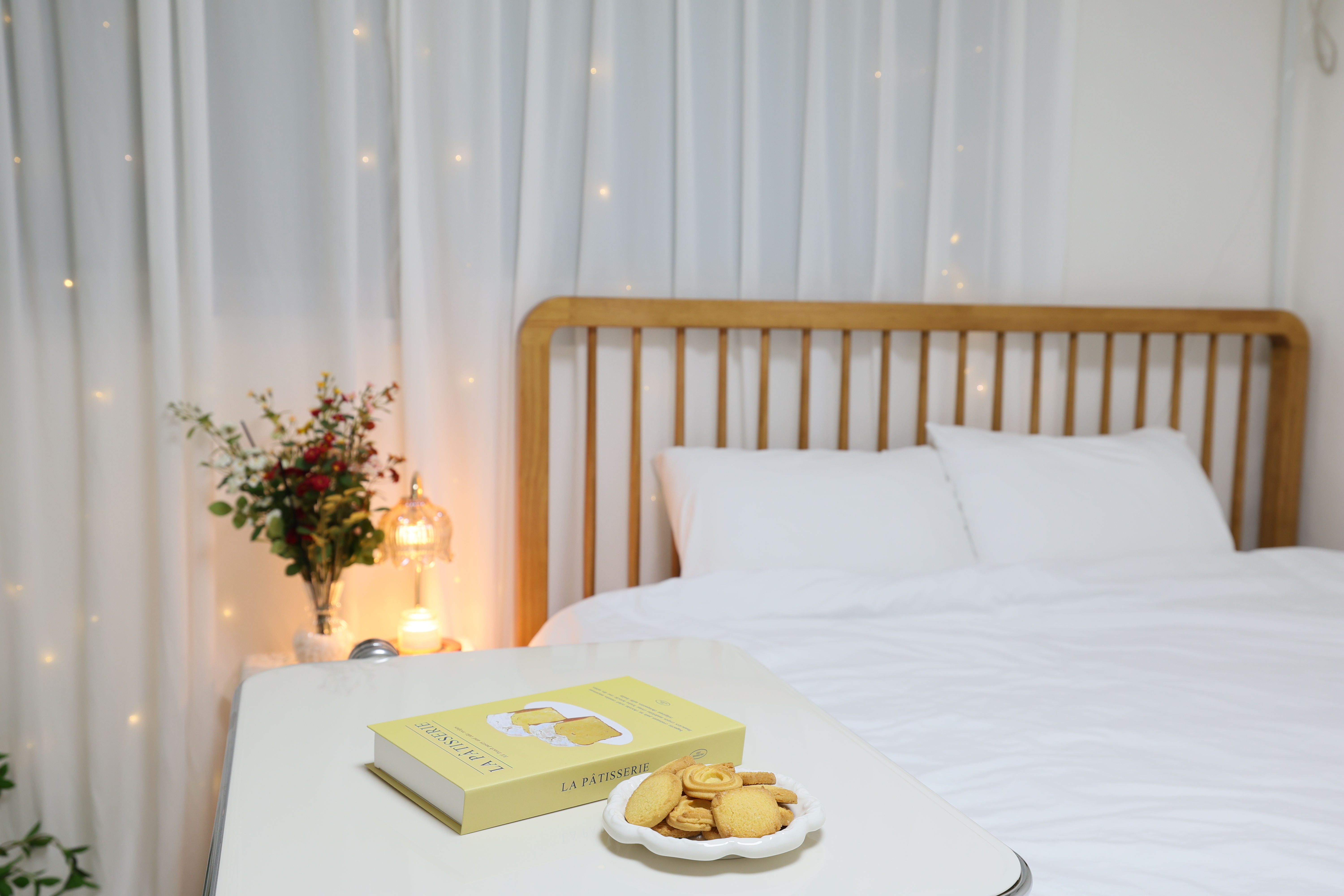 새하얀 침대 위에서 달콤한 책 한 조각, 온전한 여유를 만끽하는 순간이 당신을 기다립니다.