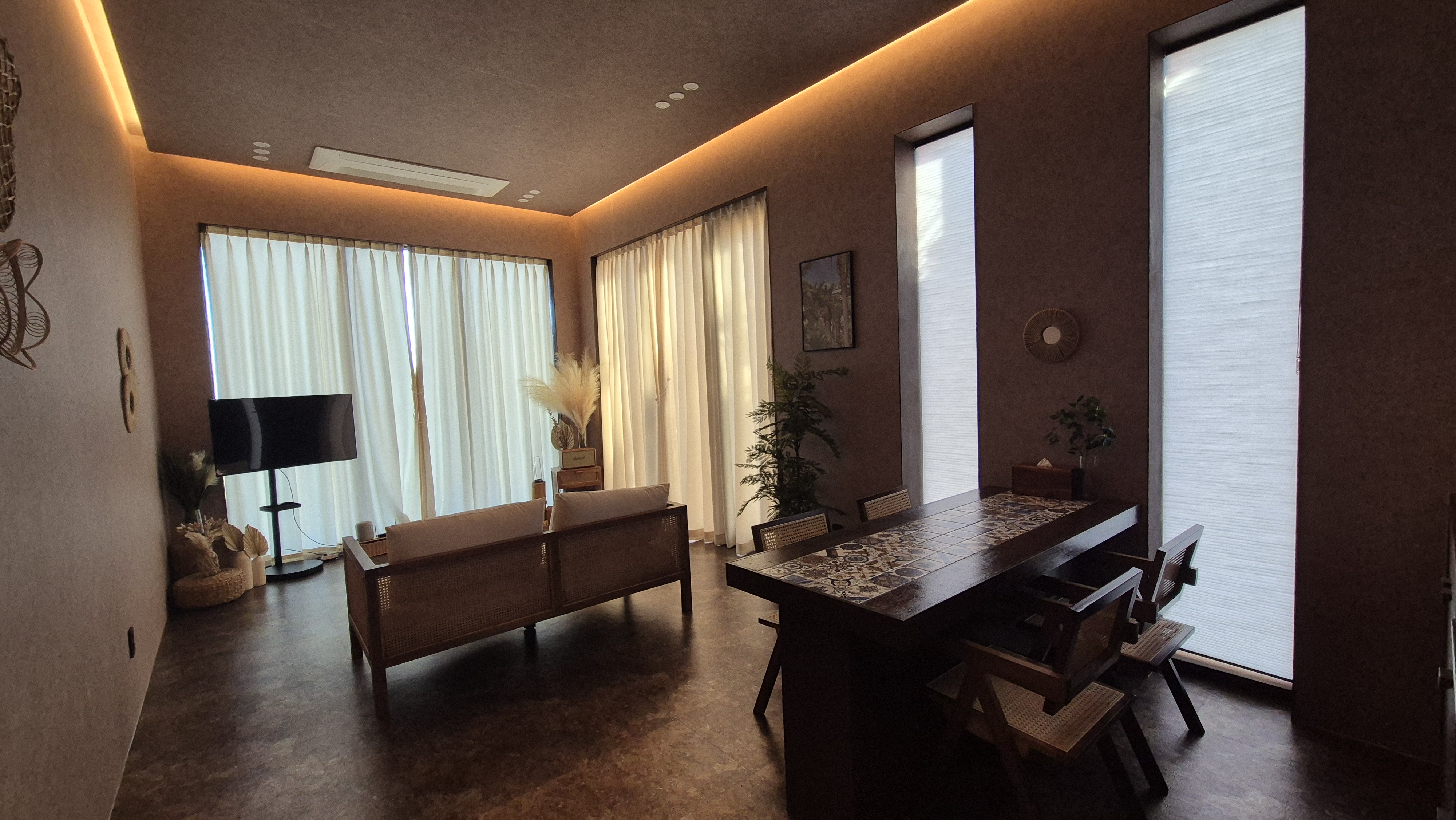 제주 속 모로코를 연상케 하는 발레나 빌라1호 객실입니다. - 기준인원: 2인(최대 3인) 인원추가 시 추가비용 1박당 2만원발생) *24개월 미만 아동의 경우 인원미포함 [객실 구성] - 기준 2인(최대 3인) 24*개월 미만 유아의 경우 인원추가비 X - 전객실 동일 타입의 구성으로 오픈형 객실 준비되어있습니다. - 침실공간: 퀸사이즈 베드1개와 싱글사이즈 베드 1개 - 거실공간: 공간분리된 거실(티 테이블 및 원목쇼파, 티테이블) * 단차가 있어 이동에 유의부탁드립니다. - 주방공간: 2인기준의 바테이블과 간단한 취사도구(조미료 미제공), 3인기준의 식기류, 전자렌지, 커피포트기, 냉장고 - 욕실공간: 화장대, 다이슨 드라이기, 샴푸, 린스, 바디워시, 수건 *세안도구 및 치약칫솔은 직접 준비해주셔야합니다. - 야외공간: 야외 수영장 및 자쿠지(자쿠지 이용은 별도의 추가비 발생), 야외 썬베드 *자쿠지 이용안내 - 자쿠지 이용은 별도의 추가비가 발생합니다.(1박 기준 5만원) - 자쿠지 물을 받는데 소요되는 시간은 대략 1시간정도 소요되며, 산간시골지역의 문제로 자쿠지 물받는 동안 객실 내부의 샤워시설에서는 수압이 많이 약해질 수 있습니다. ※ 야외 시설의 경우 너무 늦은시간 큰소리로 이용 시 다른 객실의 손님의 이용에 불편함을 줄 수 있으니 11시 이후에는 큰 고성방가는 제자 부탁드립니다.