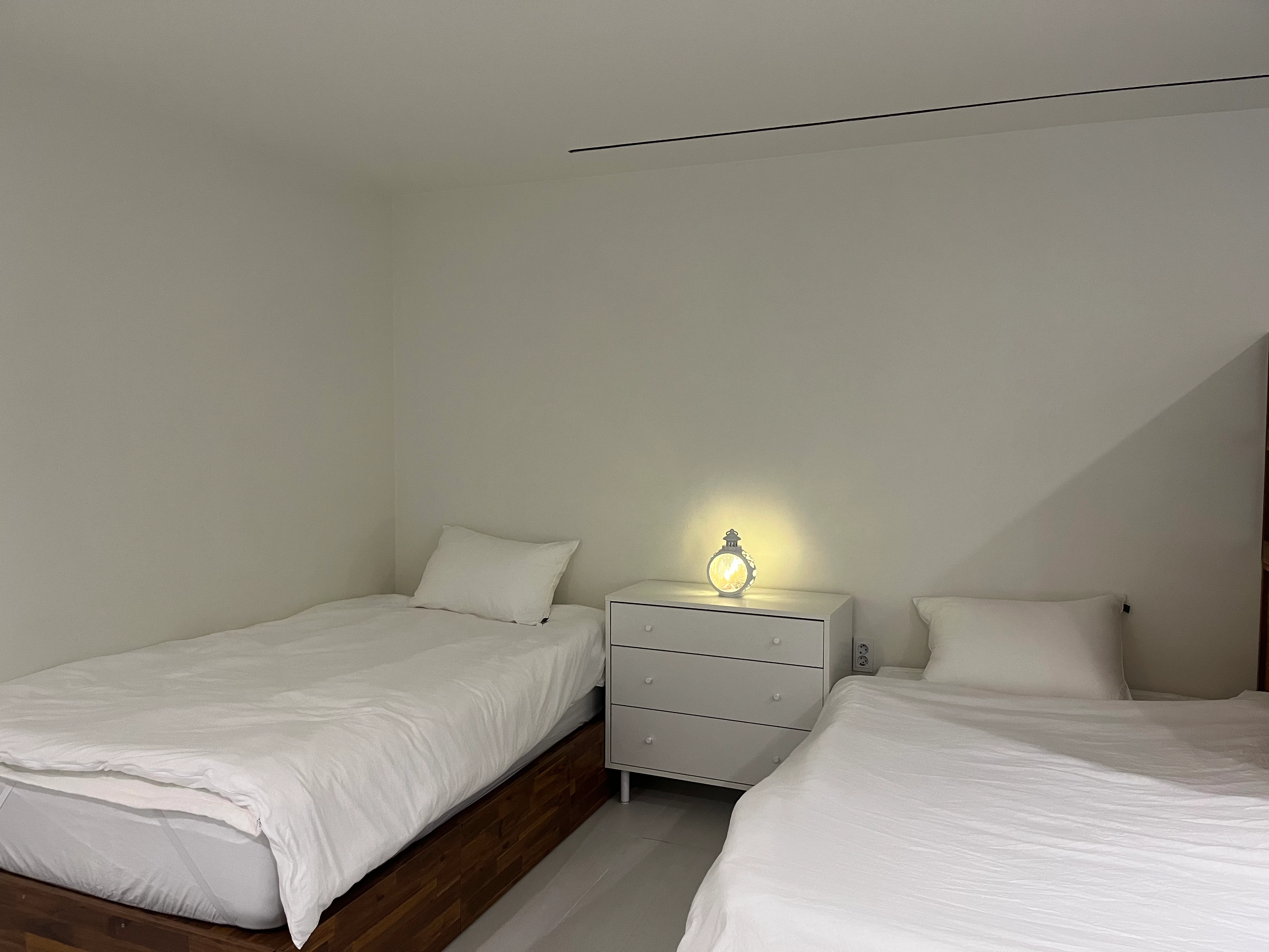 편안한 슈퍼싱글 침대 2개가 마련된 아늑한 지하 1층 객실