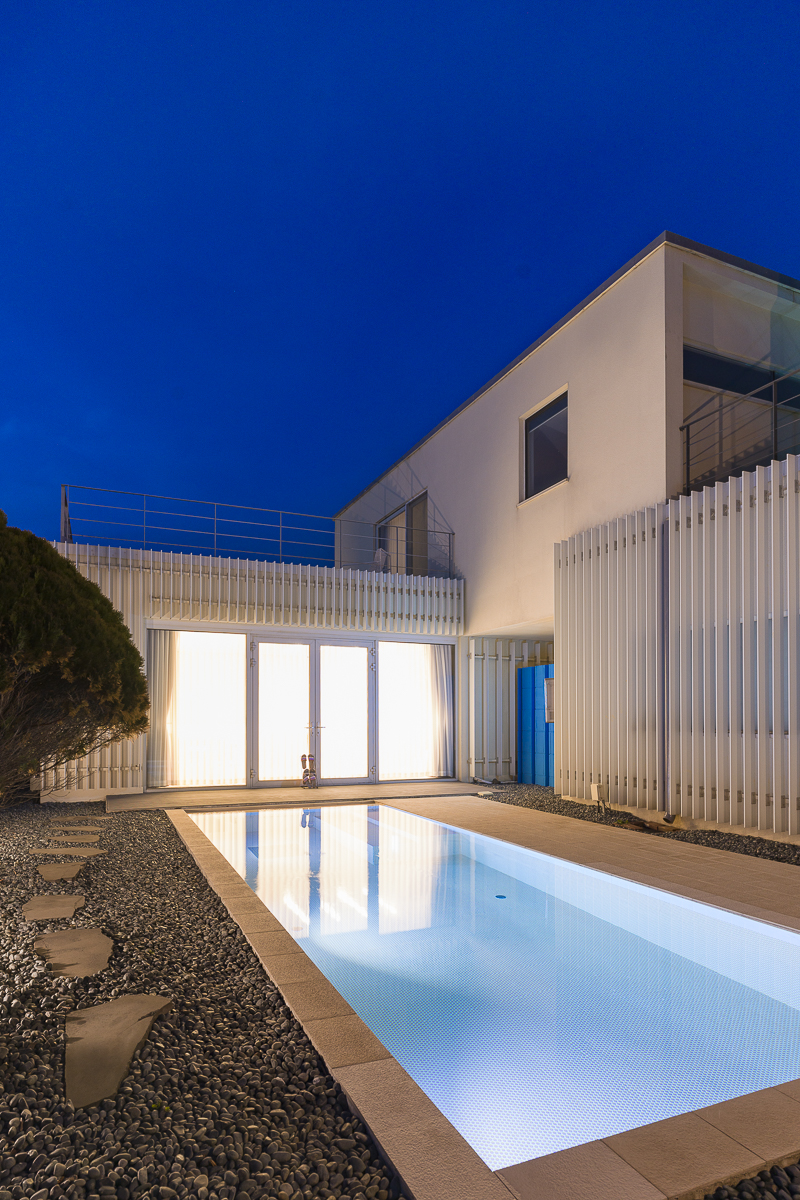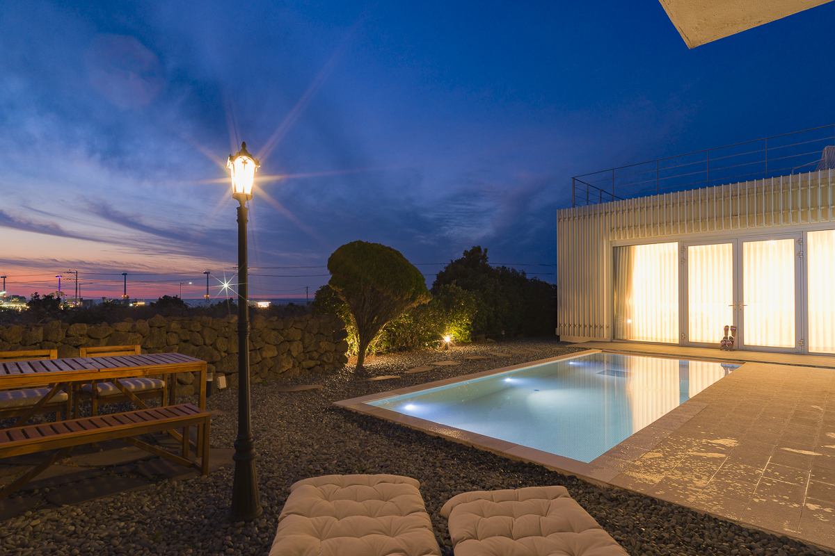 황혼이 물드는 하늘 아래, 고요히 빛나는 밤의 수영장.