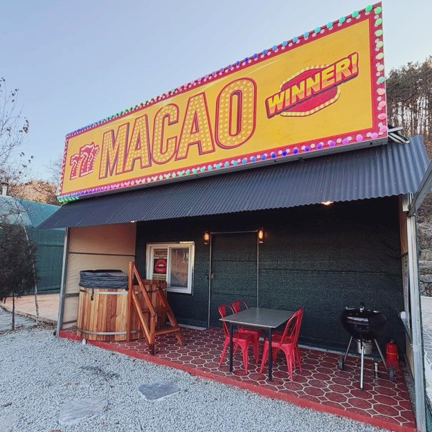마카오 홀덤펌 컨셉 글램핑, 개별 히노끼탕과 온수풀 파티
