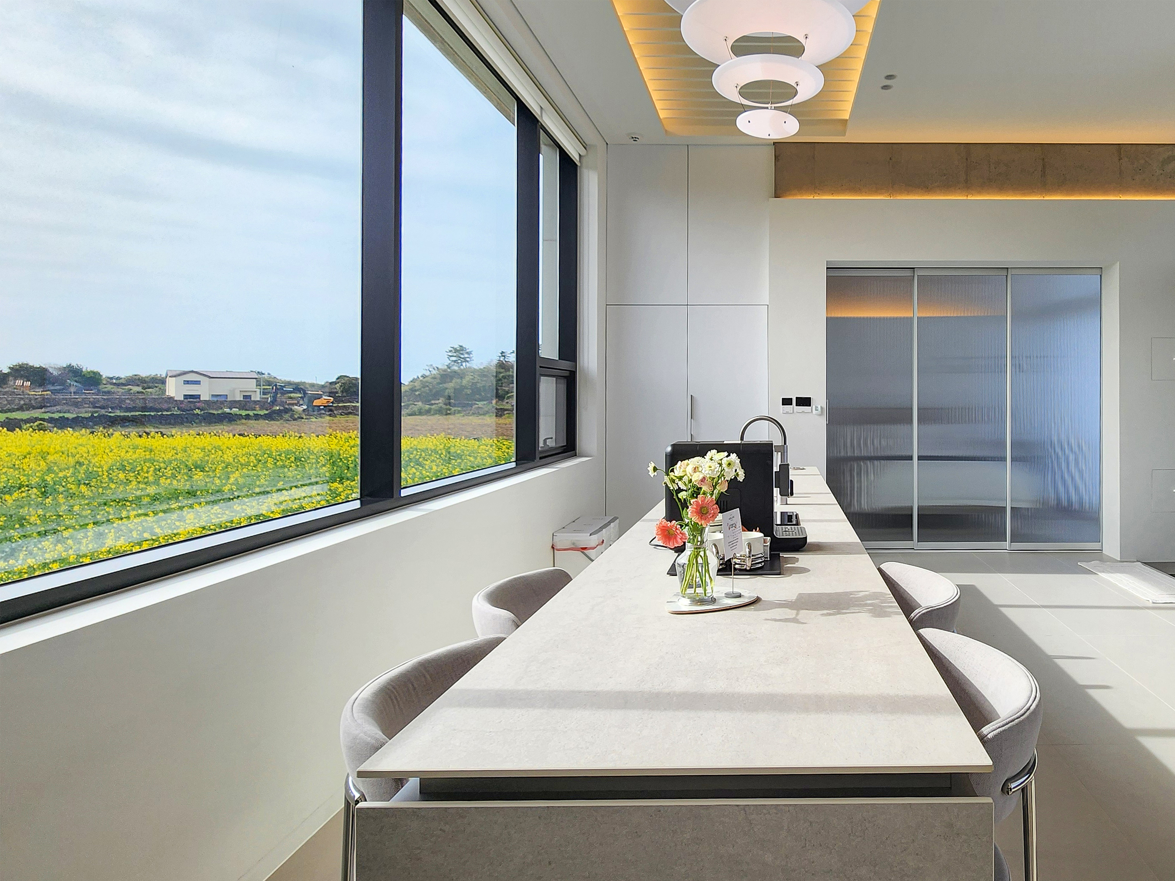 창밖으로 펼쳐진 노란 물결, 제주의 숨결이 부드럽게 스며듭니다.