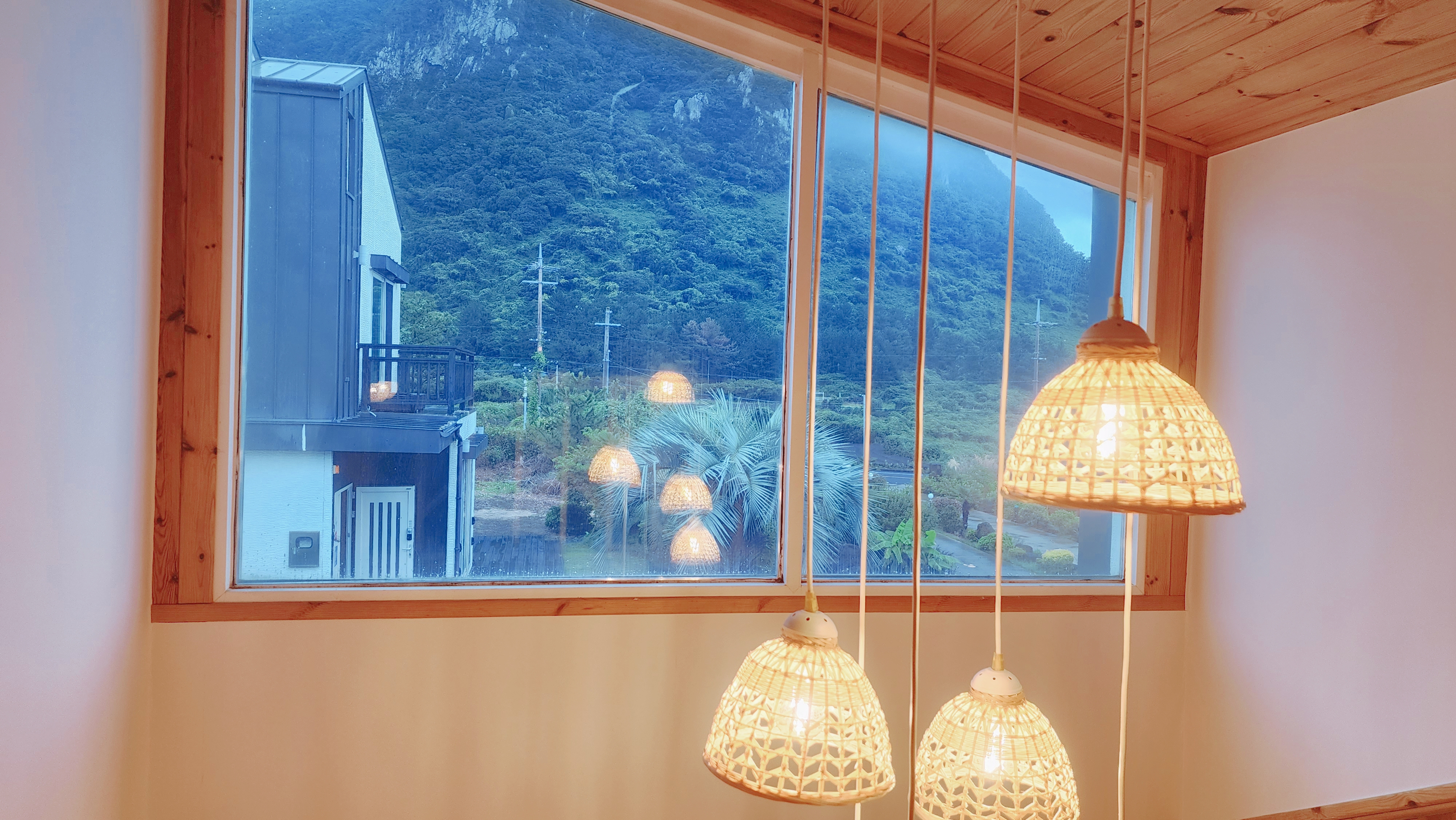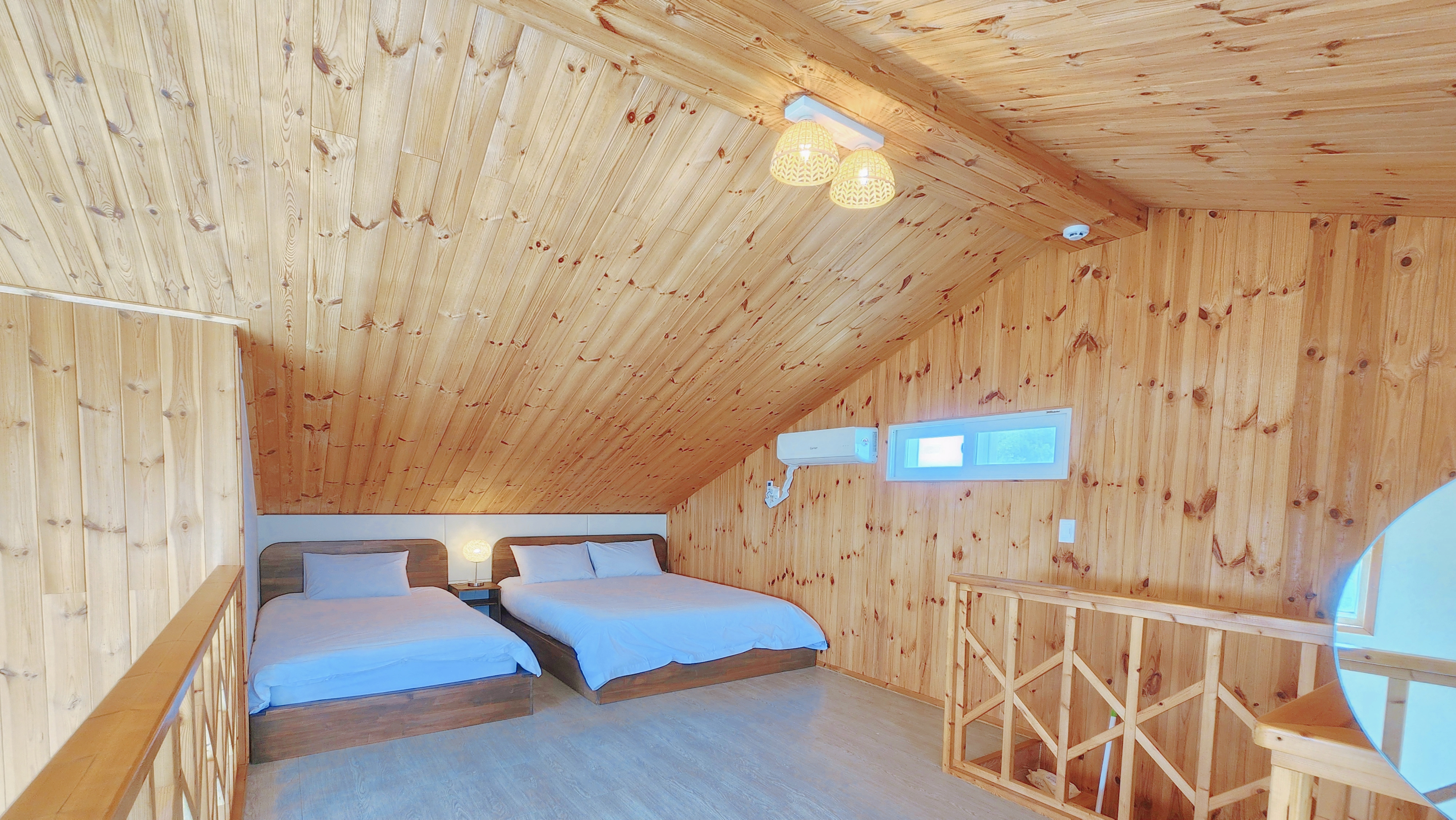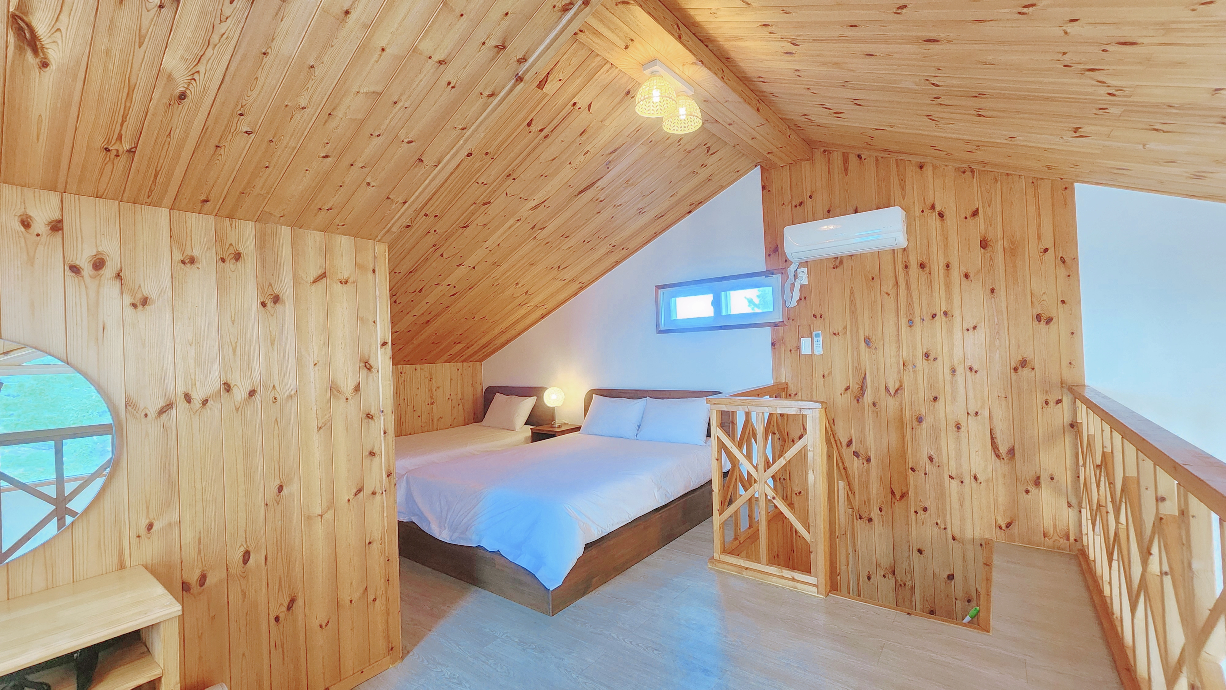 원룸형, 복층, 침대방(퀸1,싱글1), 거실 겸 주방(온돌방), 취사가능, OTT(넷플릭스), 화장실1, 개별냉난방, 테라스, 산방산뷰