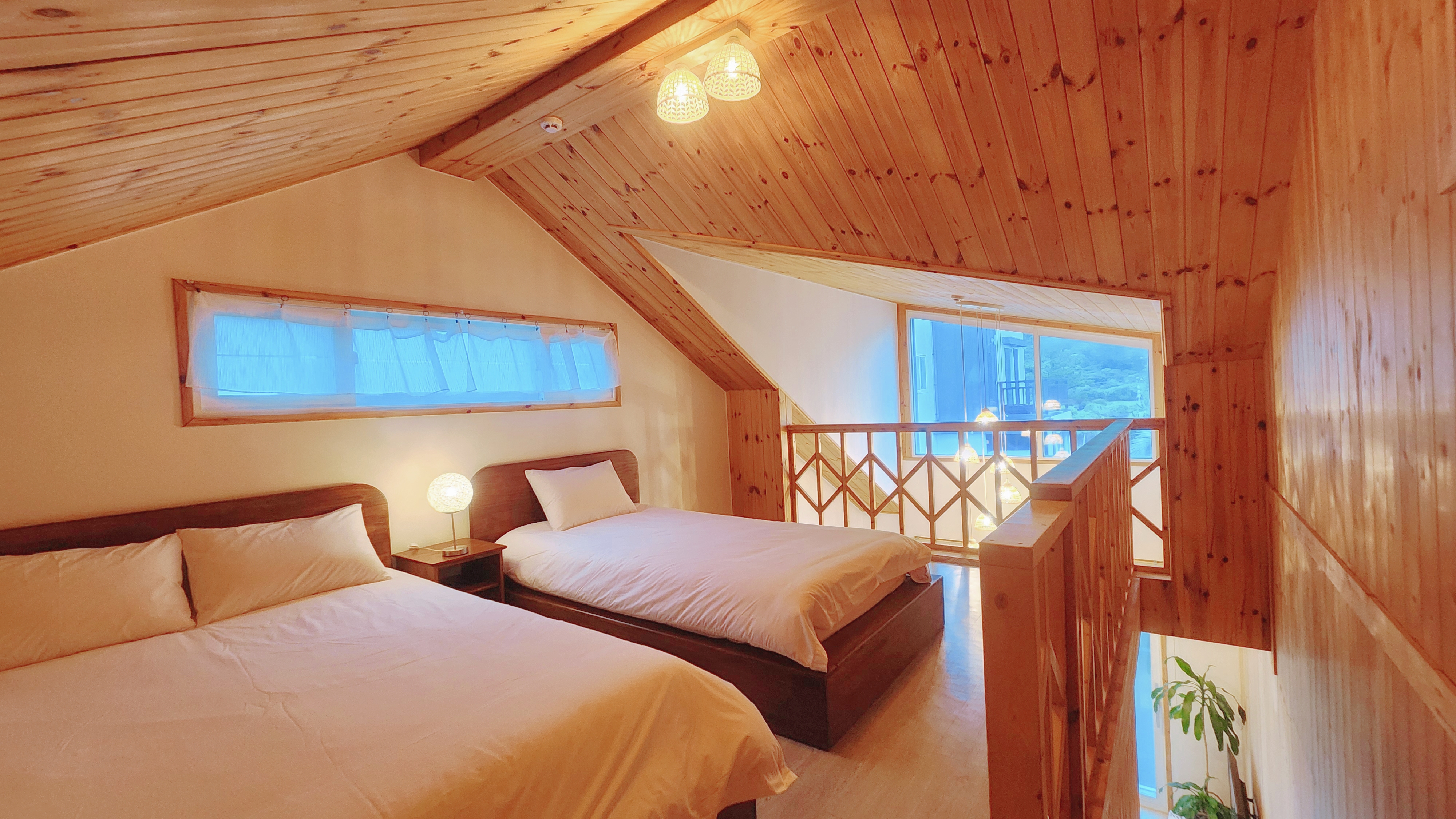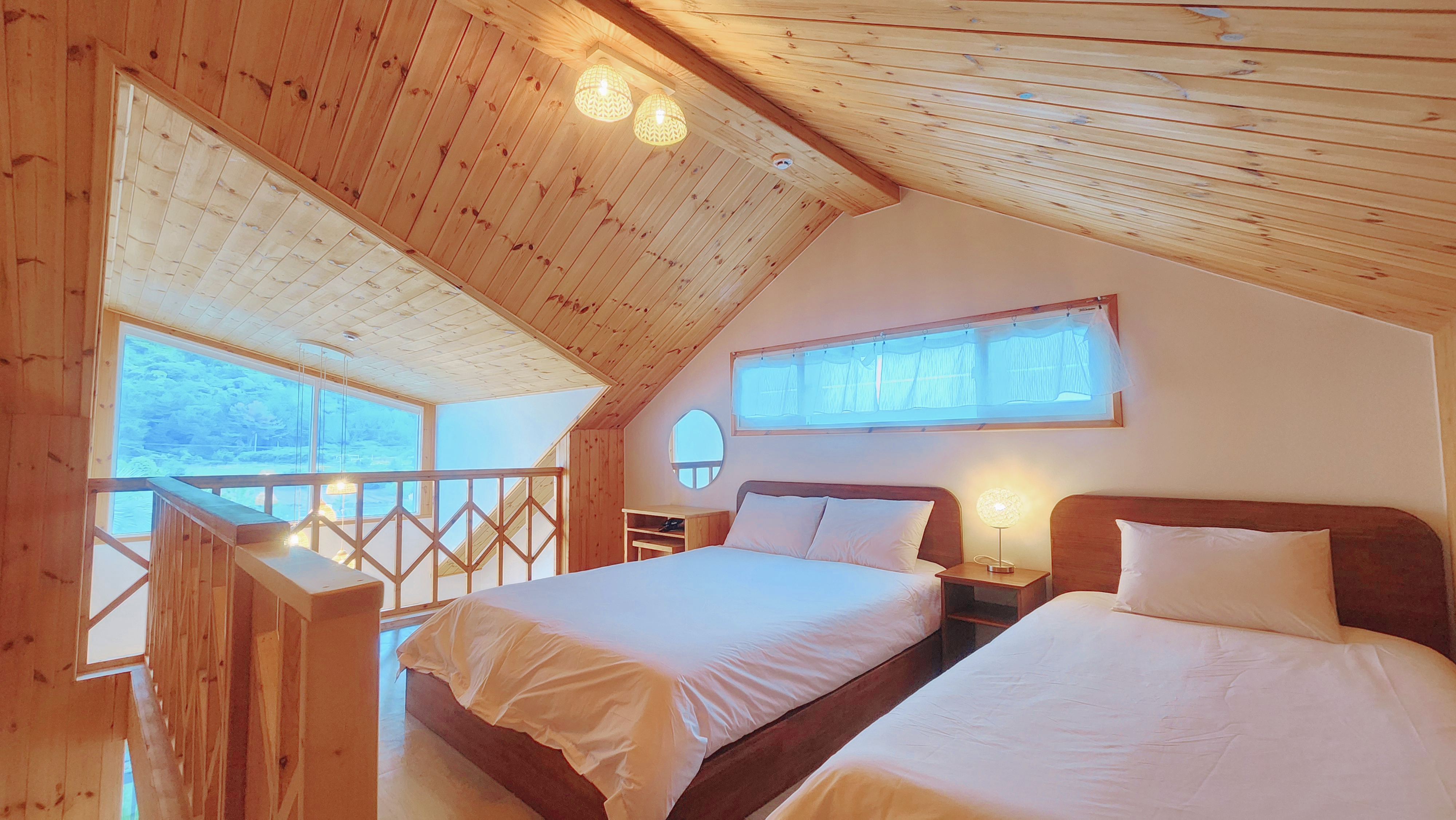 원룸형, 복층 침대방(퀸1,싱글1), 퀸토퍼매트리스1, 거실 겸 주방(온돌방), 취사가능, OTT(넷플릭스), 화장실1, 개별냉난방, 테라스, 산방산뷰, 오션뷰