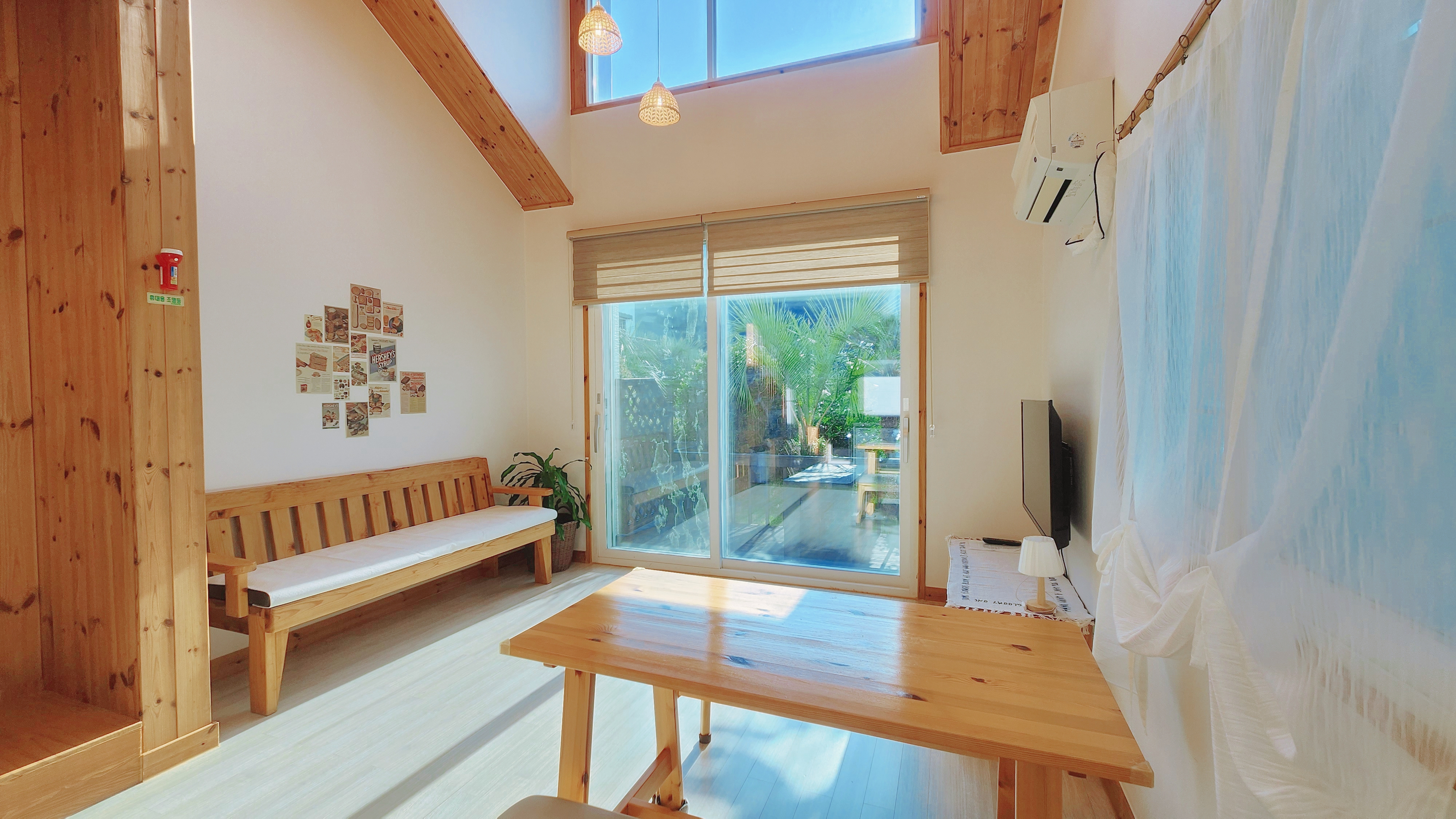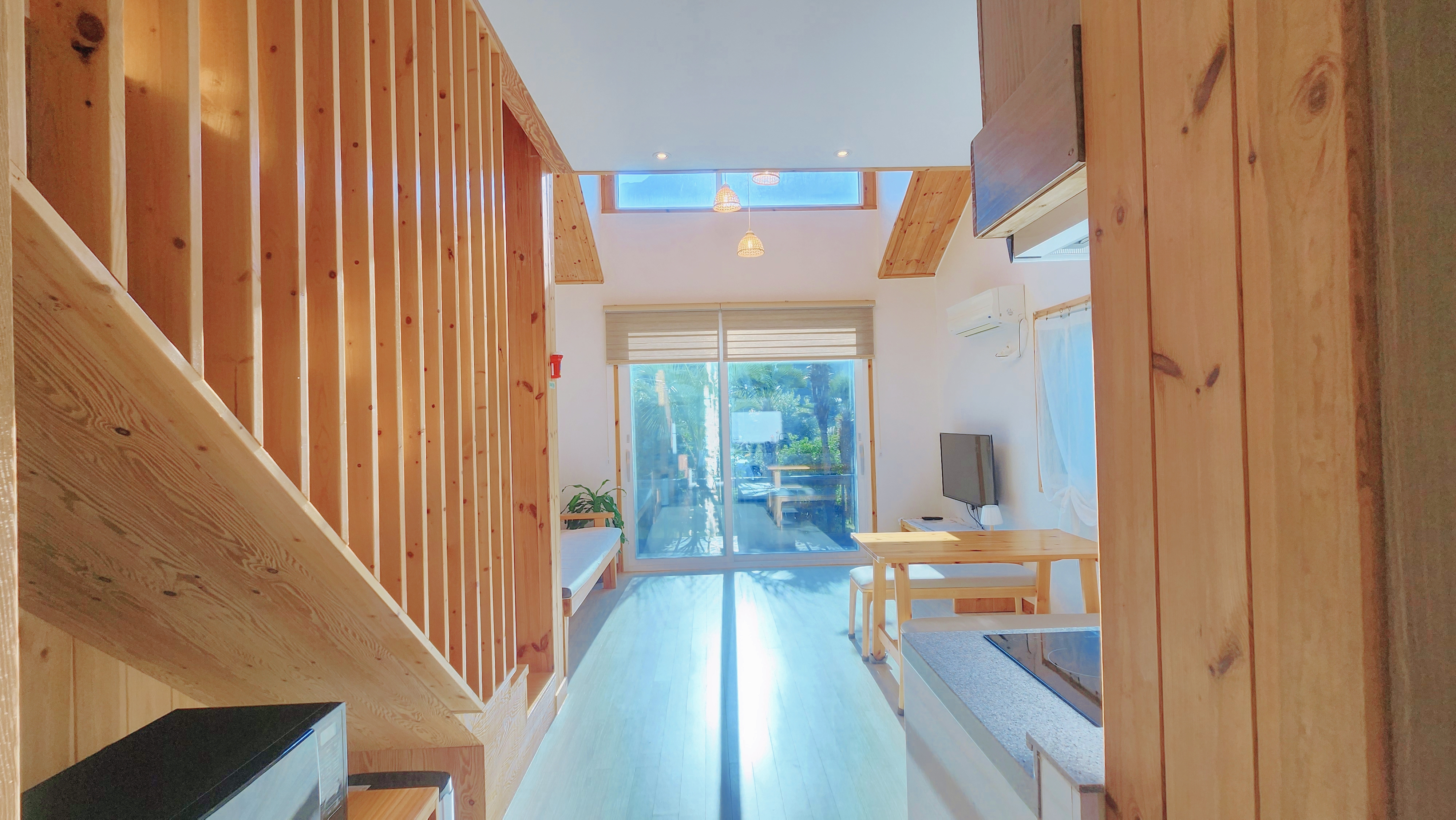 원룸형, 복층 침대방(퀸1,싱글1), 거실 겸 주방(온돌방), 취사가능, OTT(넷플릭스), 화장실1, 개별냉난방, 테라스, 산방산뷰